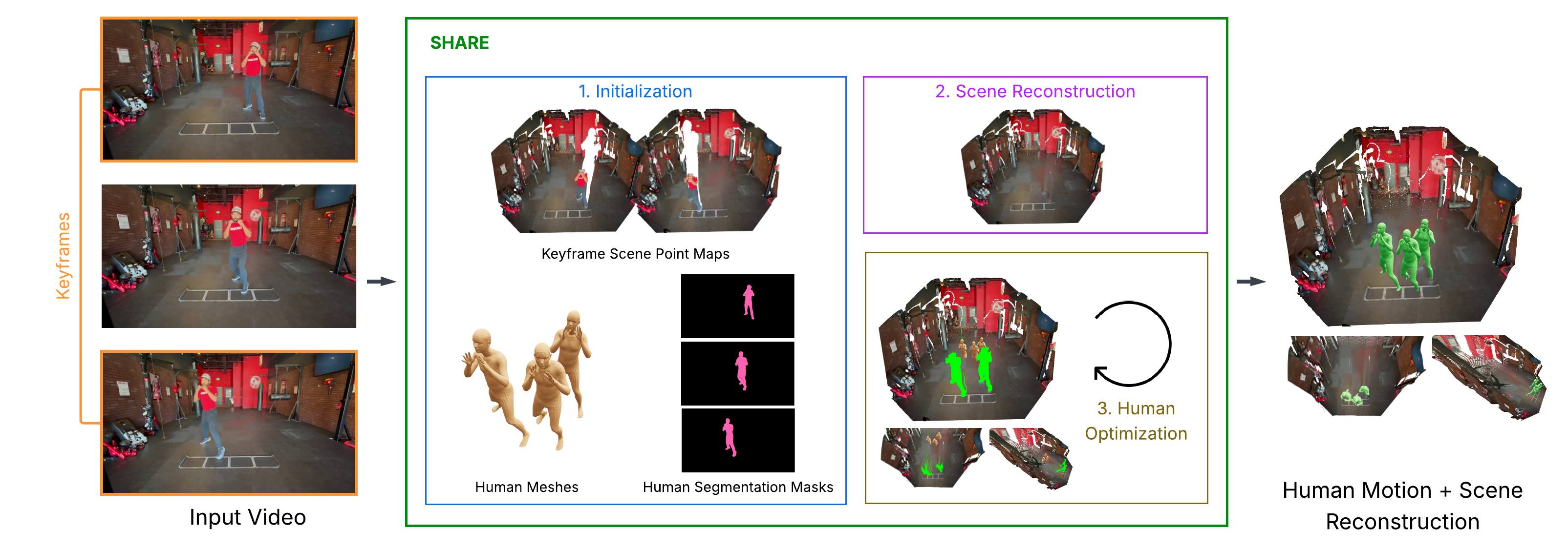 SHARE is a new method for accurately placing 3D human motion into real scenes from a single monocular video. By aligning human meshes with scene geometry and ensuring temporal consistency, SHARE produces more realistic human–environment interactions and outperforms existing reconstruction approaches on both curated and in-the-wild videos.