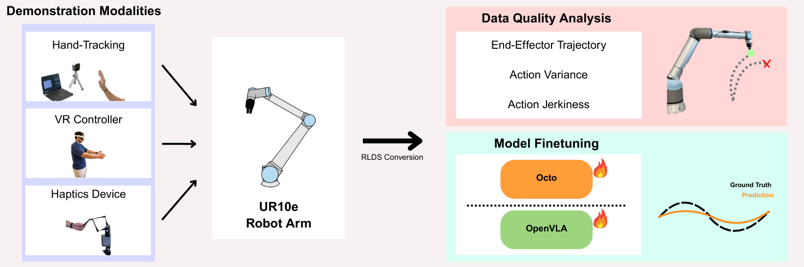 We investigate how different teleoperation interfaces shape the quality of robot learning data. In a study of 400 demonstrations on assistive tasks (wiping and lamp switching), we compare VR controllers and a haptic device, measuring operator workload with NASA-TLX and fine-tuning the Octo model under varying conditions. Our findings reveal clear modality-driven differences in data quality and downstream imitation learning performance, offering practical guidance for designing robot data collection strategies.